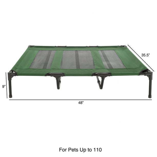 PRODUCT DETAILS - Materials: Mesh, Coated Steel, PVC Connectors, and Water-Resistant Canvas. Dimensions: (L) 48'x (W) 35.5' x (H) 9'. XL Dog Bed Carrying Case Included. For pets up to 110lbs. Color: Green.