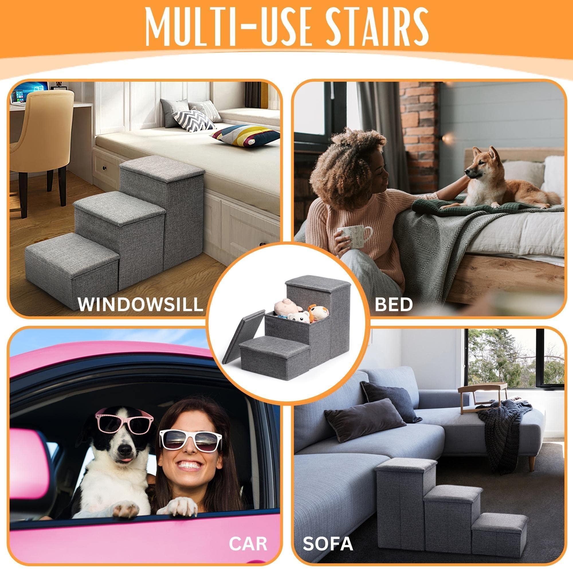 2.Store Toys & Treats Inside- These bed steps for dogs are ergonomically designed, with storage compartments inside the 3 steps. Put all your favorite toys, treats, leashes and more in here and reduce clutter!