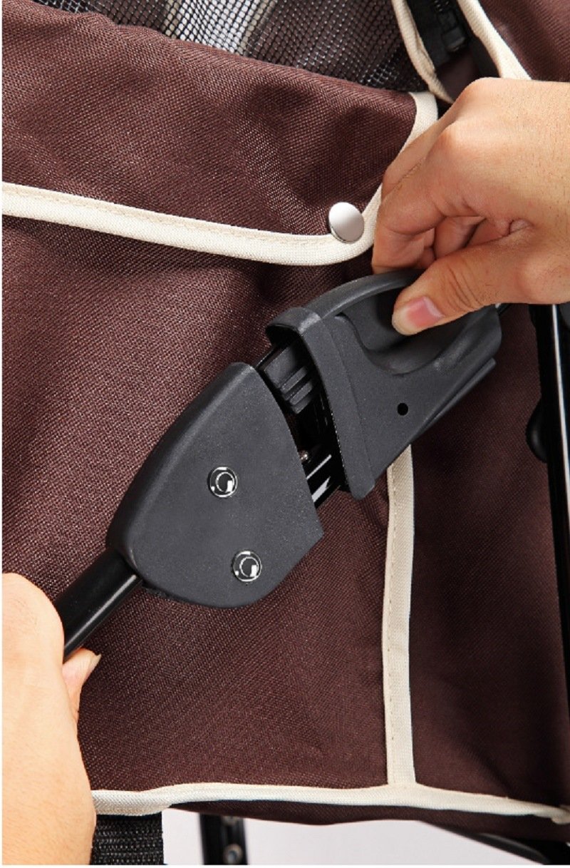1.Front universal wheels, and rear directional wheels with brake lever included for easy parking, as well as a safety leash inside to keep your pet securely strapped in. 2 pairs of reflective strips on the front and back for attention.