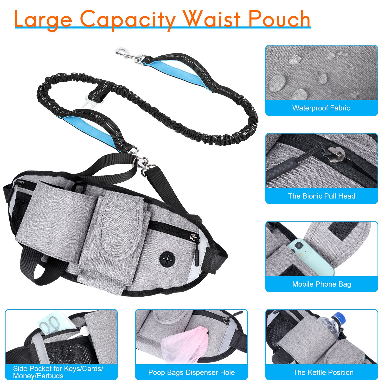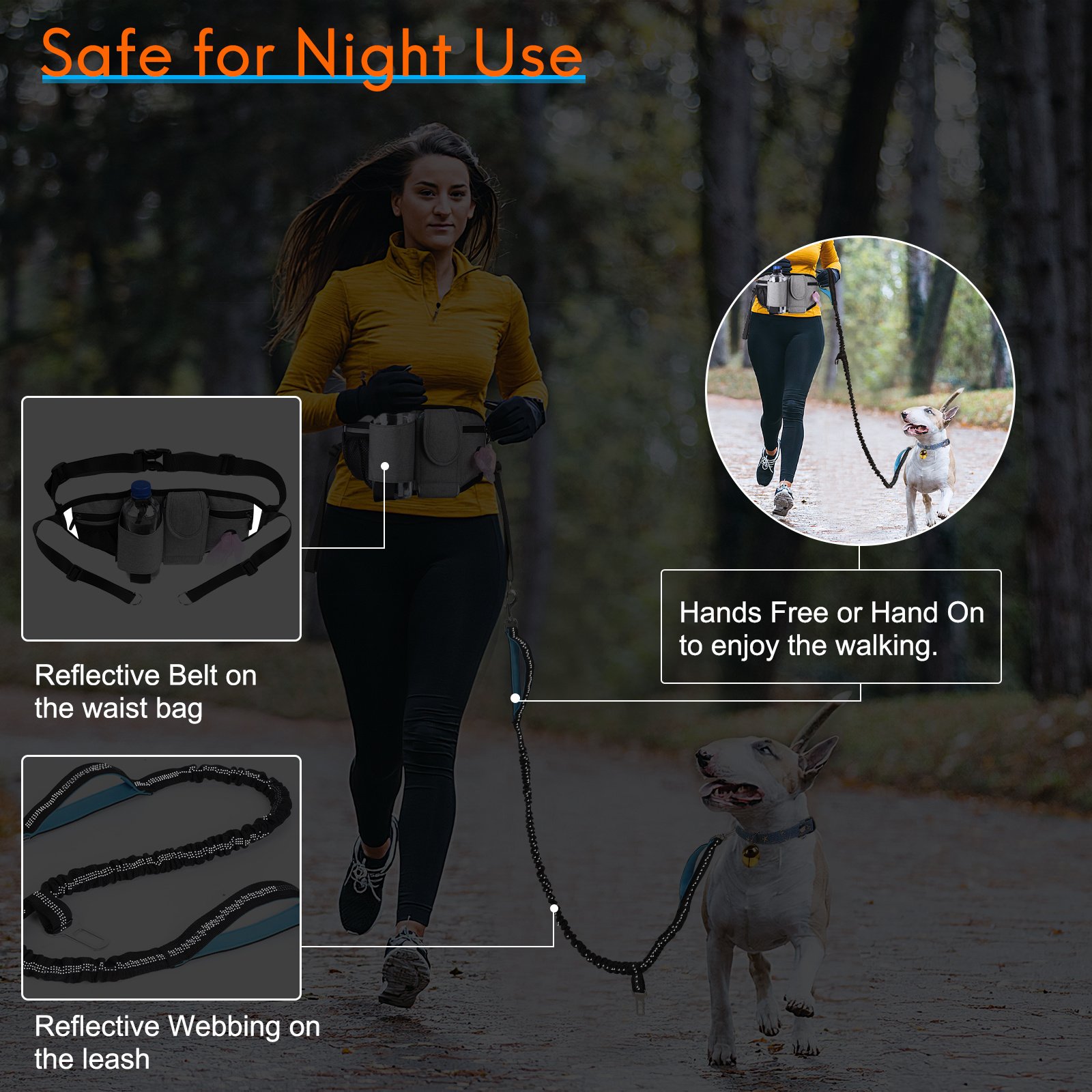 Home > Hands Free Dog Leash with Waist Bag for Walking Small Medium Large Dogs; Reflective Bungee Leash with Car Seatbelt Buckle and Dual Padded Handles; A