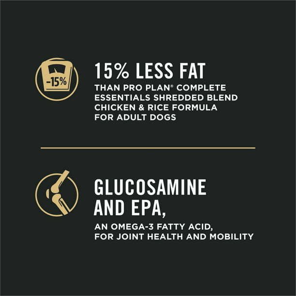 Purina Pro Plan Weight Management for Adult Dogs, Care for your large dog's nutritional needs with Purina Pro Plan Dog Food Weight Management Large Breed Chicken Rice Formula adult dry dog food. Each serving contains high-quality protein, including chicken as the first ingredient, and this healthy weight dog food features 27 percent protein and 9.5 percent fat to help him maintain an ideal weight and body condition. Natural prebiotic fiber, sourced from wheat bran, helps promote your canine companion's digestive health. This weight management dog food formula contains 15 percent less fat than Pro Plan ESSENTIALS Shredded Blend Chicken Rice Formula for Adult Dogs.